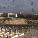 Neste momento cercam a zona por trás do cemitério, onde se encontram pombais, para os destruir.