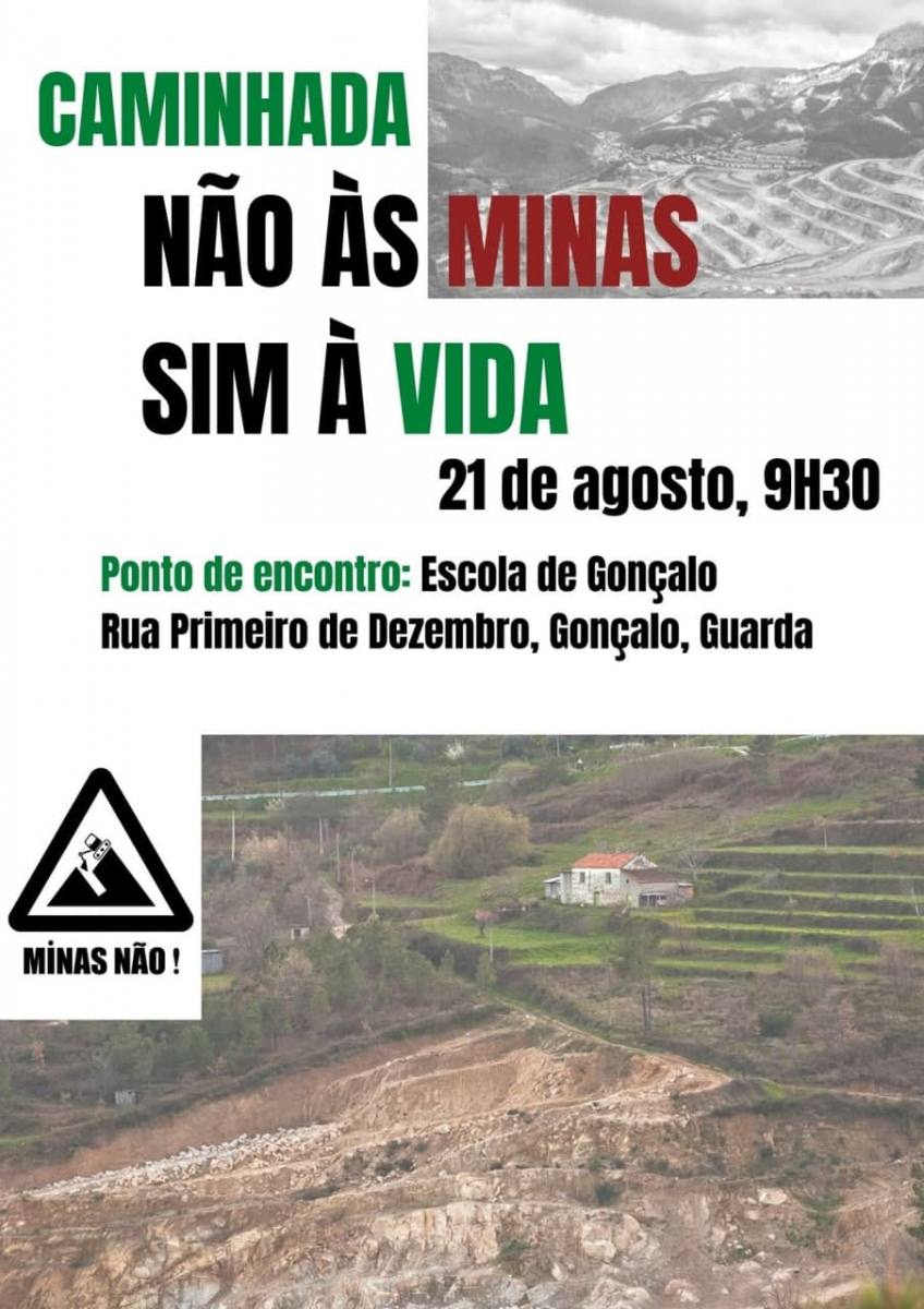 Para o próximo dia 21 de Agosto, o Movimento ContraMineração Beira Serra, a Greve Climática Estudantil da Guarda e a Associação Guardiões da Serra da Estrela organizam uma caminhada que, às 9h30, sai da Escola de Gonçalo, na rua Primeiro de Dezembro, na Guarda. Uma iniciativa que pretende contestar as pretensões extractivistas para a região Beira Serra, onde há 4.788 km2 de pedidos privados de prospecção e pesquisa, «num total de 15 zonas, abrangendo 34 concelhos, bem como 3 zonas (Guarda-Mangualde, Argemela e Massueime) com uma área de 1536 km2 destinadas a concurso público internacional promovido pelo Governo português, e ainda uma zona já em vias de exploração a céu aberto, também na Argemela, com 403.71 hectares», conforme se pode ler na nota enviada à imprensa pela organização.