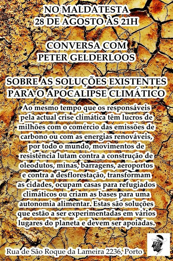 Mais para o final do mês, no dia 28, desta vez no Porto, na Livraria Maldatesta, está marcada para as 21h uma conversa com Peter Gelderloos «sobre as soluções existentes para o apocalipse climático, onde a luta contra a mineração terá uma lugar de relevância».