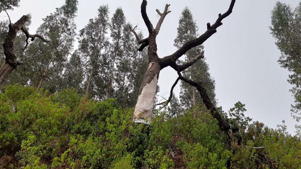 Para retomar a vossa questão sobre a persistência deste modelo, é importante ter em conta que o protagonismo crescente do eucalipto a partir da década de 1960 resultou de uma série de fatores, que incluem os incentivos estatais à florestação dos terrenos particulares, a crise cerealífera de meados do século, com o progressivo abandono da célebre Campanha do Trigo, e o início do êxodo rural massivo, que foi muito evidente nas freguesias serranas da serra de Monchique. O eucalipto tornou- -se cada vez mais central, tanto na economia nacional como nas economias locais, o que ajuda a explicar a sua expansão e persistência até à atualidade. Para mais, houve uma forte continuidade em termos de política florestal, como tem vindo a ser estudado, entre a última década do Estado Novo e o período da democracia. Por último, importa talvez explicar que as próprias matas de eucalipto atuaram sobre a realidade política e social. Em 1967, o comandante regional da GNR em Faro dizia que era necessário proibir as queimadas até ao final de setembro, muito depois da época em que eram habituais na economia agrícola da região. O argumento era de que estas podiam provocar «grandes incêndios» prejudicando, nas suas palavras, «a economia nacional e o património do estado», como tinha acontecido no ano anterior com um incêndio que devastou parte da serra de Monchique, chegando até Aljezur. O que temos aqui é o início da substituição de um calendário agrícola – pautado pelos tempos de roça e queima, de semear e colher – por um calendário meteorológico de risco de incêndio que visava proteger a nova economia do eucalipto. Estas novas preocupações não eram, porém, exclusivas do estado, passaram a estar também presentes do lado das próprias comunidades rurais. Um entrevistado contou-nos, num balanço desta transição, que antes não era necessária qualquer autorização para os pastores queimarem os pastos e que os donos das terras geralmente não se importavam, uma vez que as eventuais perdas eram diminutas: «hoje é diferente, hoje está plantado de eucaliptos».